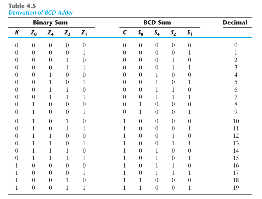 - The adder will form the sum in binary and produce a result that ranges from 0 through 19. These binary numbers are listed in Table 4.5 and are labeled by symbols \(K, Z_8, Z_4, Z_2, and Z_1\). K is the carry, and the subscripts under the letter Z represent the weights 8, 4, 2, and 1 that can be assigned to the four bits in the BCD code.