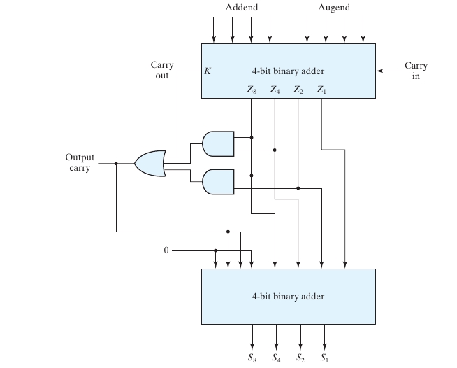 - The condition for a correction and an output carry can be expressed by the Boolean function \(C = K + Z_8Z_4 + Z_8Z_2\)