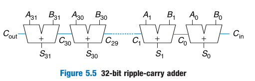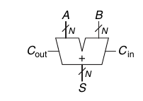 Simplest way; chain together N full adders. \(C_{out}\) of one stage acts as \(C_{in}\) for next stage. Disadvantage: Slow when N large. The carry ripples through the carry chain.