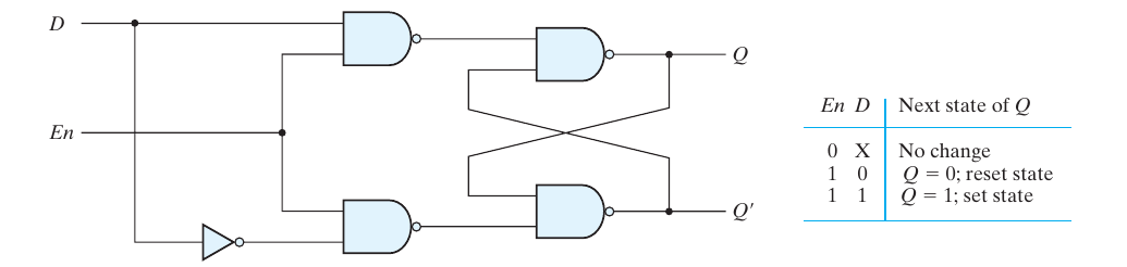 - When En = 1, the latch is transparent. The data at D flows through to Q as if the latch were just a buffer. When En = 0, the latch is opaque. It blocks the new data from flowing through to Q, and Q retains the old value. Hence, the D latch is sometimes called a transparent latch or a level-sensitive latch.