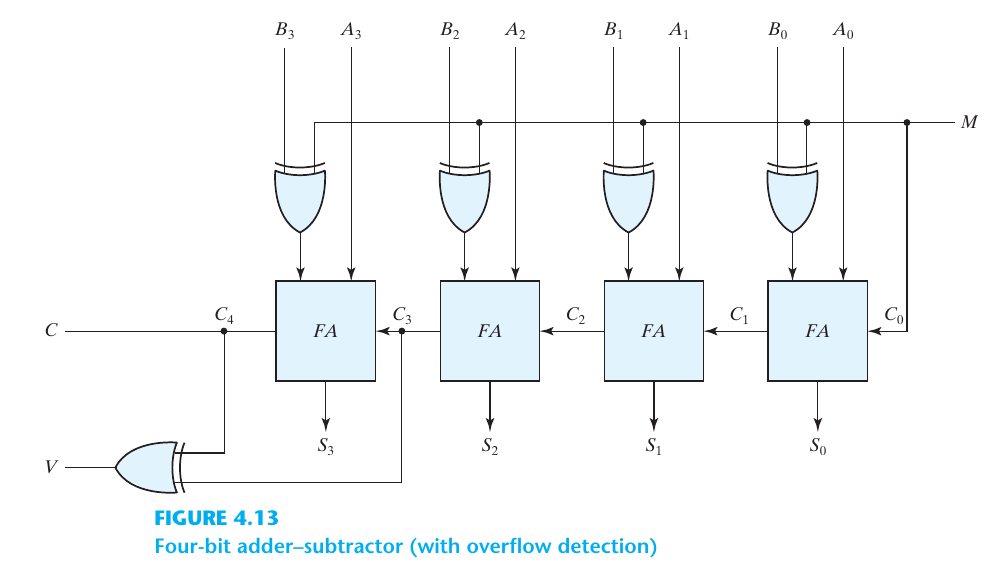 When M = 0, the circuit is an adder, and when M = 1, the circuit becomes a subtractor. It is worth noting that binary numbers in the signed-complement system are added and subtracted by the same basic addition and subtraction rules as are unsigned num- bers. Therefore, computers need only one common hardware circuit to handle both types of arithmetic. The user or programmer must interpret the results of such addition or subtraction differently, depending on whether it is assumed that the numbers are signed or unsigned.