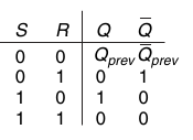 - The outputs, Q and Q’, are normally complementary. When R is asserted, Q is reset to 0 and Q’ does the opposite. When S is asserted, Q is set to 1 and Q’ does the opposite. When neither input is asserted, Q remembers its old value, \(Q_{prev}\).