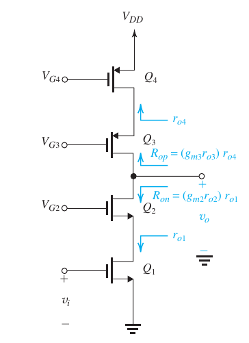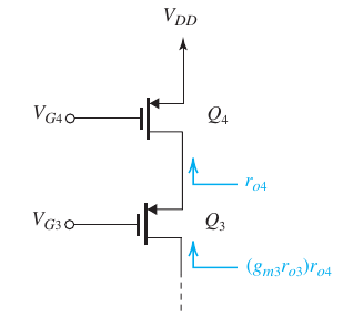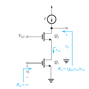 - Comparing with a source-degenerated CS amp, \(R_s = r_{o1}\) so \[R_o = (g_{m2}r_{o2}) \ r_{o1}\]