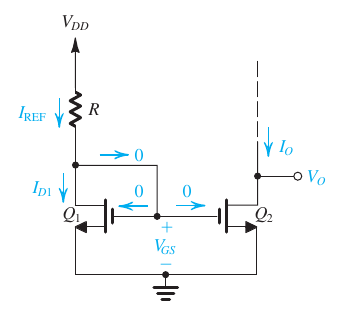 - \(I_{REF} = I_{D1} = \frac{1}{2}k_n’(W/L)_1(V_{GS}-V_{Tn})^2\)
