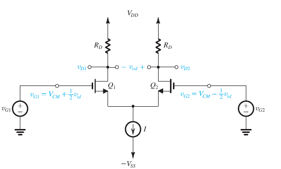 - \[v_{D1} = v_{D2} = V_{DD} - (I/2)R_D\]