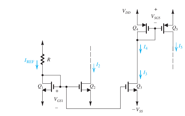 \[I_2 = I_{REF}\frac{(W/L)_2}{(W/L)_1}\] \[I_3 = I_{REF}\frac{(W/L)_3}{(W/L)_1}\]